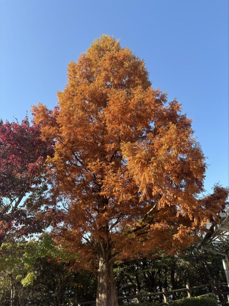 園内のメタセコイアの木がだんだんと黄色からレンガ色に染まり始めました。